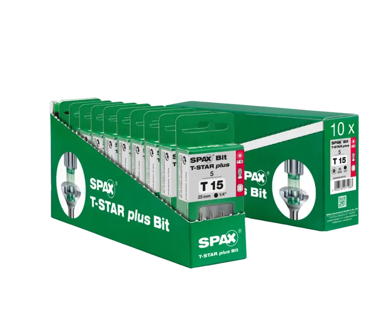 T-STAR PLUS BITS säljs i 5-pack och finns i storlekarna T15–T30. Bitsen är 25 mm långa och är särskilt anpassade för SPAX-skruvar med T-STAR plus-spår för optimal passform och bättre kraftöverföring.