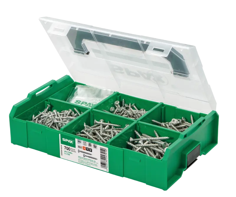 Komplett skruvbox med 700 SPAX-skruvar – alltid rätt skruv nära till hands.