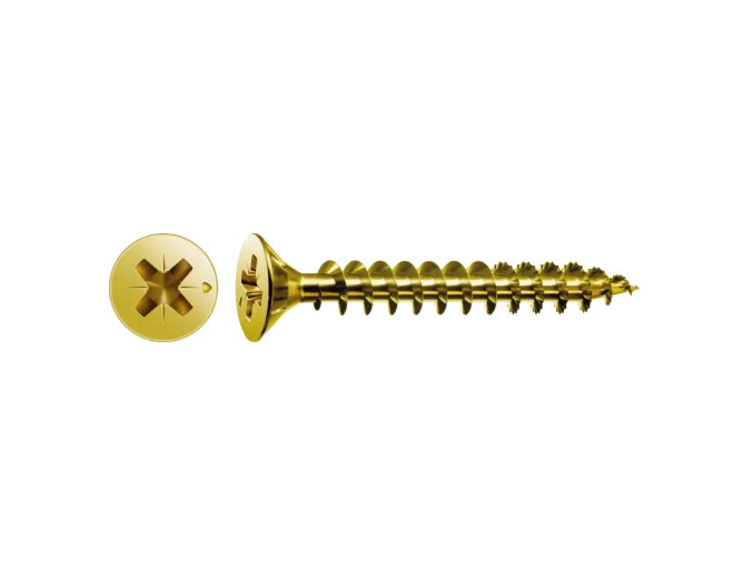 SPAX försänkt träskruv med PZ1 (Pozidriv) , gulförzinkad, är en högkvalitativ skruv framtagen för säkra och hållbara infästningar i trä.